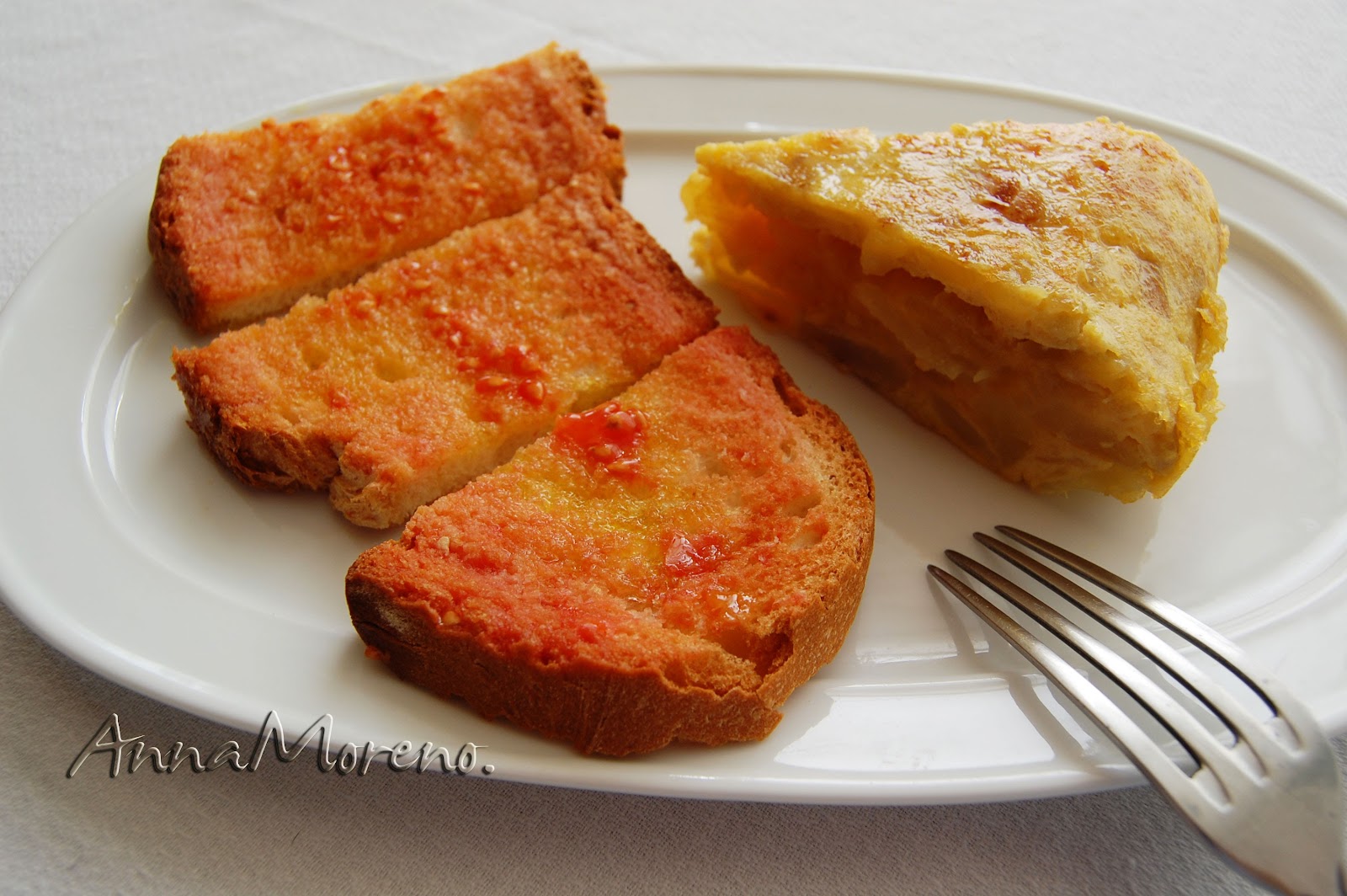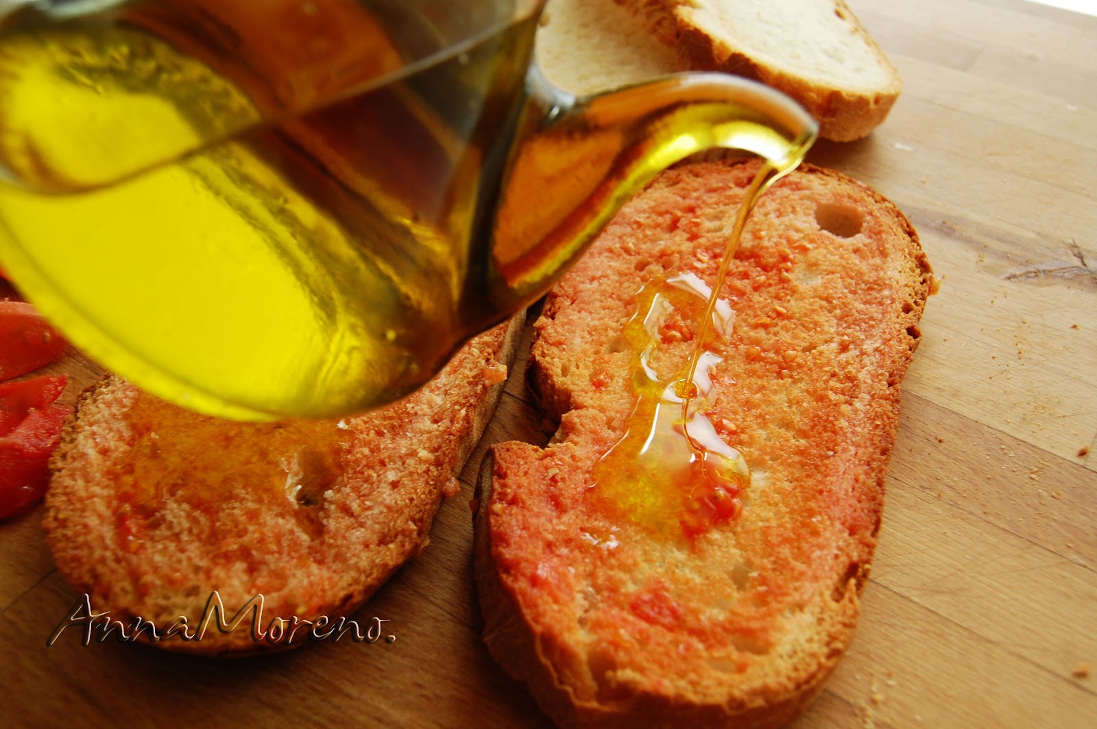 Para el pan con tomate o pà amb tomàquet, como tantas veces he mostrado, se tiene que hacer en el mismo momento de servir, jamás con antelación. Se restregan los tomates maduros sobre el pan de manera que toda la pulpa quede sobre este (importante utilizar los tomates adecuados), seguido de un hilito de aceite de oliva virgen extra bien repartido sobre toda la rebanada de pan y una pizca de sal en ese orden.