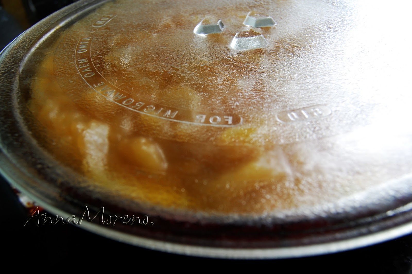 9.- Una vez cuajada la primera cara, voltear la tortilla, para ello evitar utilizar un plato del mismo diámetro que la sartén ya que no es nada práctico y resbala. Escoger un plato grande que sobrepase el diámetro de la sartén o bien que sea 'ligeramente' más pequeño de manera que quede 'encajado'. El plato del micro por ejemplo, como el que he utilizado yo, es amplio y perfecto,
