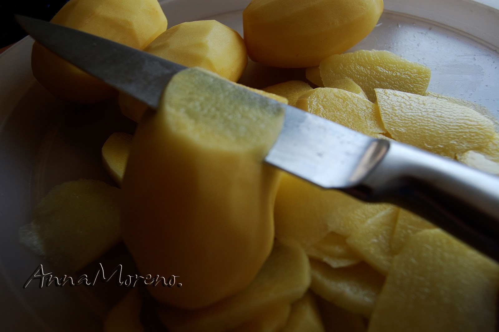 1.- Pelar y cortar las patatas en lascas finas. Reservar.