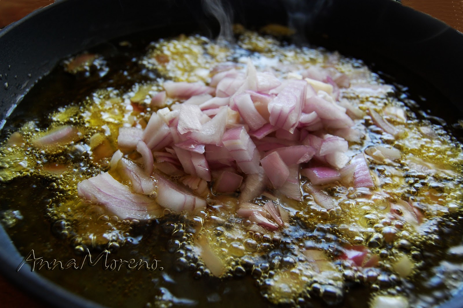 3.- Calentar una taza de aceite de oliva virgen extra en una sartén amplia y antes de que empiece a humear añadir la cebolla ya cortada.
